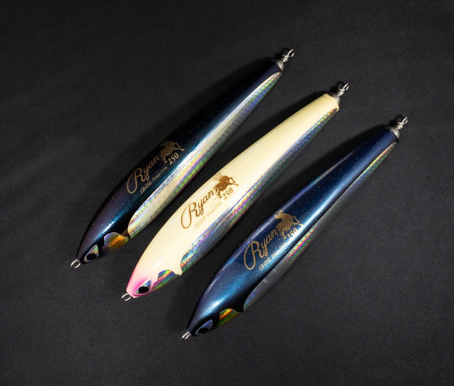 The CB One Ryan 250 stick bait is a work of art. These hand carved wooden lures feature a foil finish and a beautiful paint job. Designed to sit with its tail down at rest and create a nice bubble trail when pulled under the surface. The ‘S’ swimming action creates plenty of flash to imitate a fleeing bait fish. The Ryan 250F is an excellent lure for targeting GTs, Big Kingfish and Tuna. A must have lure for the enthusiast stick bait angler!!