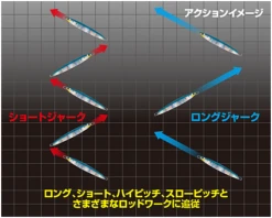 It follows various rod works such as long, short, high pitch and slow pitch, and functions regardless of tackle. The head is smoothly shaped to reduce water resistance during jerk and provide a light pulling comfort. The wide side surface receives the water flow and causes half slide and fluttering, and the wide laser surface creates a big flash appeal.