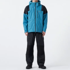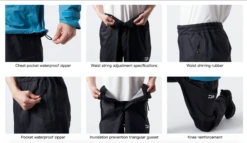 Equipped with a size adjustment cord on the waist of the pants to adjust waist fitment. A waterproof zipper reduces the ingression of water from the front pants pocket to minimise stored items in pockets from getting wet.