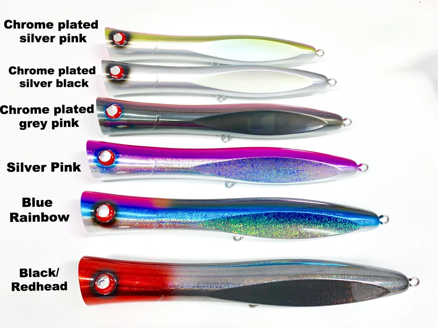 A floating popper by Japanese lure maker Extreme lures. These lures feature a smaller cup face making them easy to work through the water. Wired through and built for chasing kingfish, tuna and GT. Made from a hard resin for durability. Available in a chrome plated or normal glitter model.