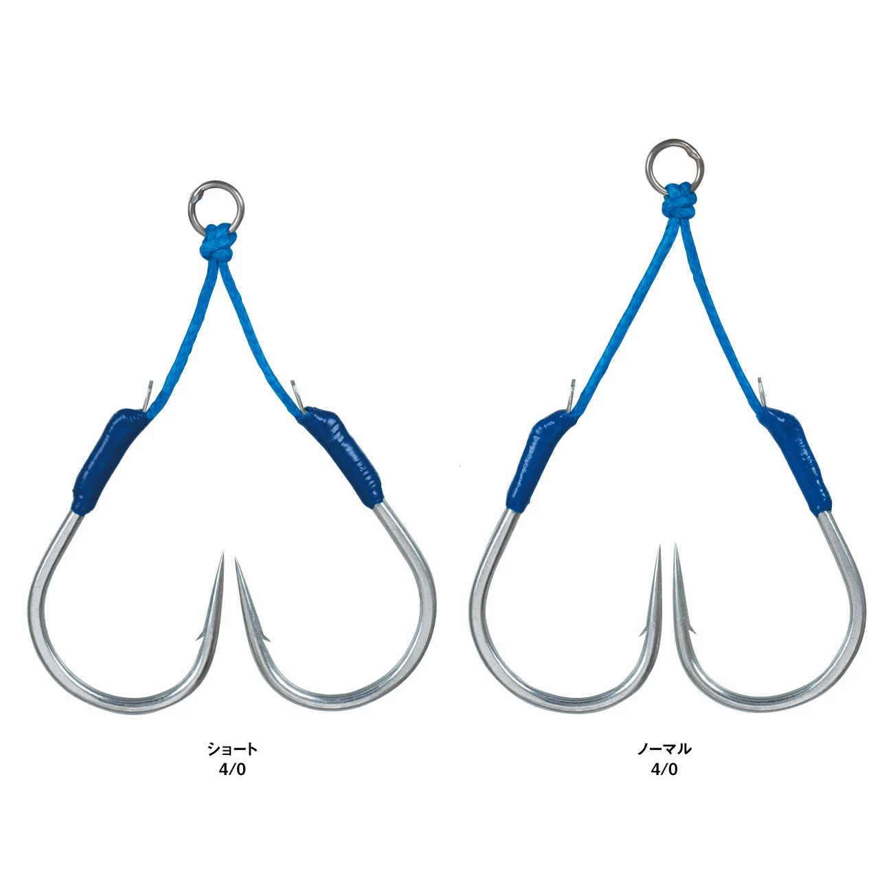 A series of double assist hooks perfect for shore jigging and boat jigging. Matched with a stiff and strong assist Gamakatsu 480 type cord to prevent unnecessary tangles and optimises a secure hook up. Suitable for shorter jigs such as slow jigs.