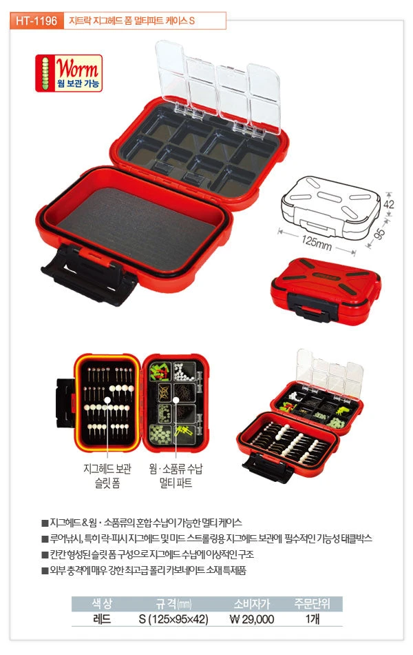 A multi purpose, super convenient jighead & soft plastic lure accessory tackle box. Featuring a foam system with series of lines to store jigheads for ease of use and convenience. A specialised tackle box to neatly store and carry around soft plastic lure accessories and jigheads with a rubber seal around the edges of the case to prevent water from entering from the sides of the box. Shockproof design for durability and prevents damages to the contents inside.