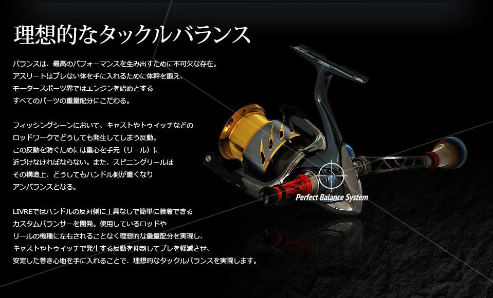 A custom balancer can be attached to the reel for the purpose of being of control the centre of gravity for the reel. It is a counter weight for the handle weight which leads to better balance and less wobble.