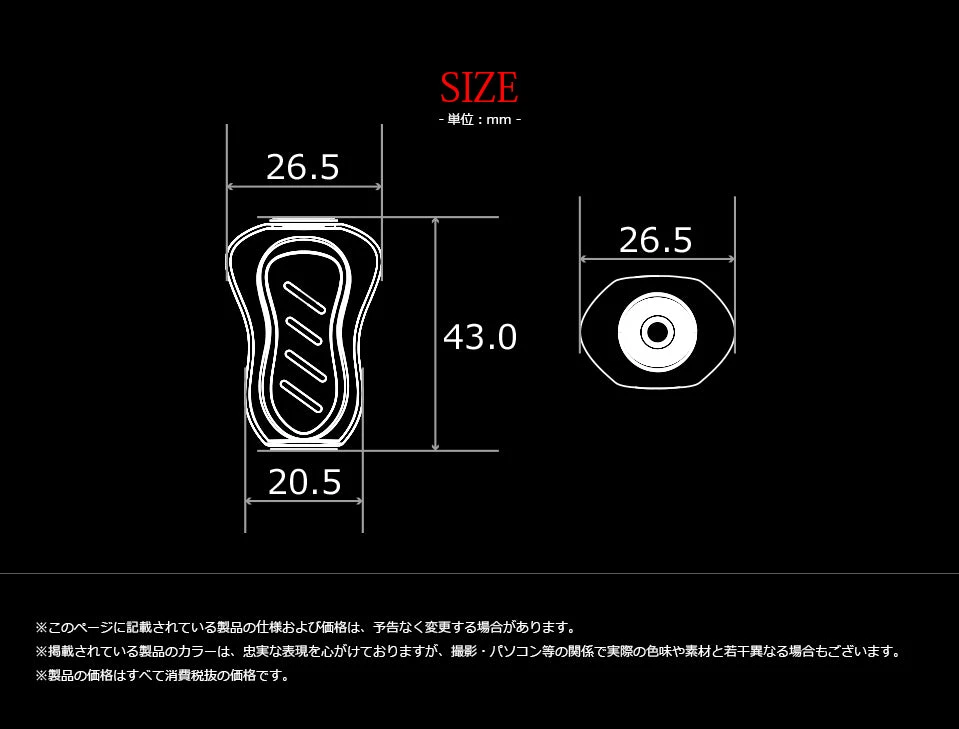 Livre Custom Reel Knob dimensions (as shown in the photo) are: 43mm in length, 26mm on the palm side and 20.5mm on the reel side.