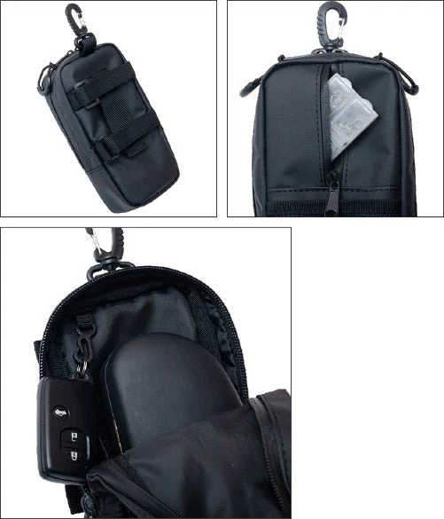 The slightly long tarpaulin pouch is a size that can store the polarized glass together with the case. You can easily access it from the pouch that you wear when you need to use polarized glasses and glasses that are essential items. In addition to that, of course, it is a compact pouch, but because it is a long size, you can make use of the generous storage capacity. In addition, front mesh pocket, vertical storage mini pocket, inner mesh pocket, key hanger hook are arranged. In addition to hook straps, it is equipped with vertical velcro tape that can be attached to the waist belt and shoulder belt. The slider pull has a loop shape that makes it easy to hold while wearing gloves.
