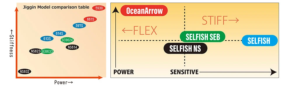 All models have the inherited the characteristics of the Selfish series with the slim, light and sharp feeling able to cut through the current, yet possessing a contradicting powerful butt section.