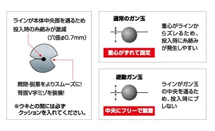 Unlike a normal gun ball, the line passes through the slit in the center of the main body freely. Since the gun ball body does not shake when thrown in, unintended entanglement is drastically reduced. It is also useful when you do not want to directly convey the weight of the weight to the fish, such as when eating is astringent.