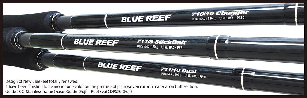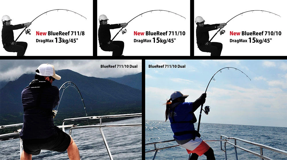 To stop GT that is swimming to the bottom of the sea while weighting on the rod, BLUE REEF series have been loaded more strength than BlueSniper series. Fulcrum point of bending curve have been set little farther than BlueSniper series so we recommend you to fight while shifting your own weight. Of course it will be worked well for king fish game that you are required to choose rod more than 6 power.
